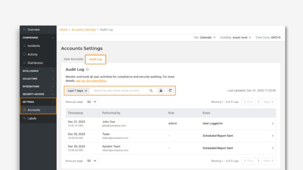 Audit Logs give your team a clear, auditable record of what’s happening inside the Lumu Portal.
