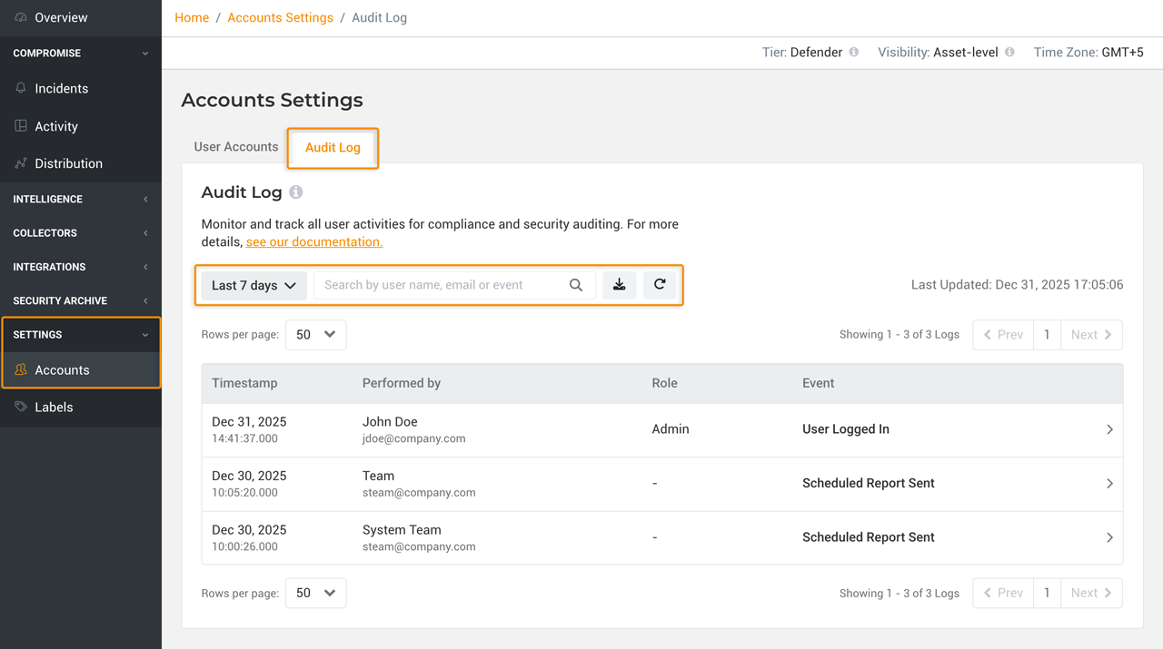 Audit Logs give your team a clear, auditable record of what’s happening inside the Lumu Portal.